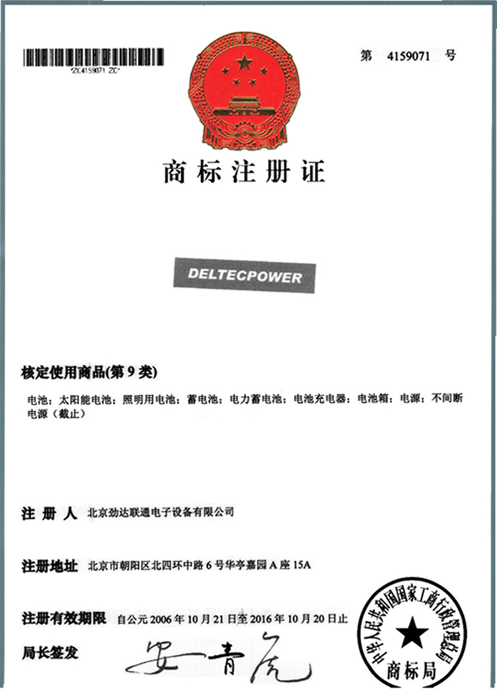 DELTECPOWER電池商標注冊證書