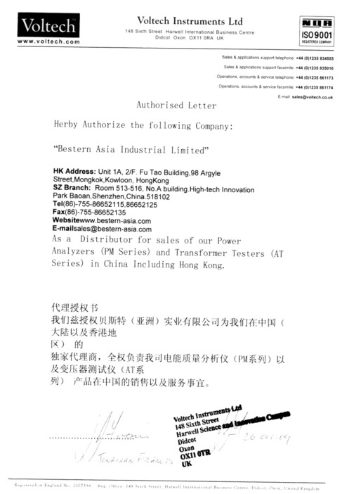 Voltech授權代理證書