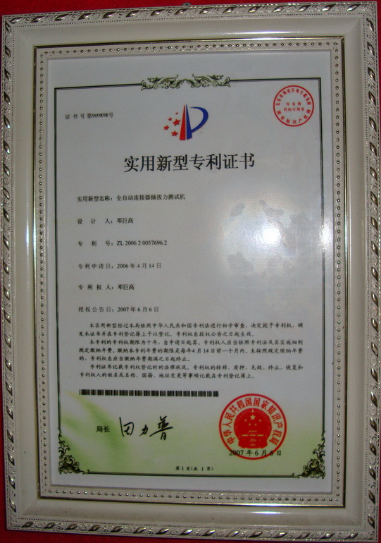 實用新型專利產品證書-連接器插拔力試驗機