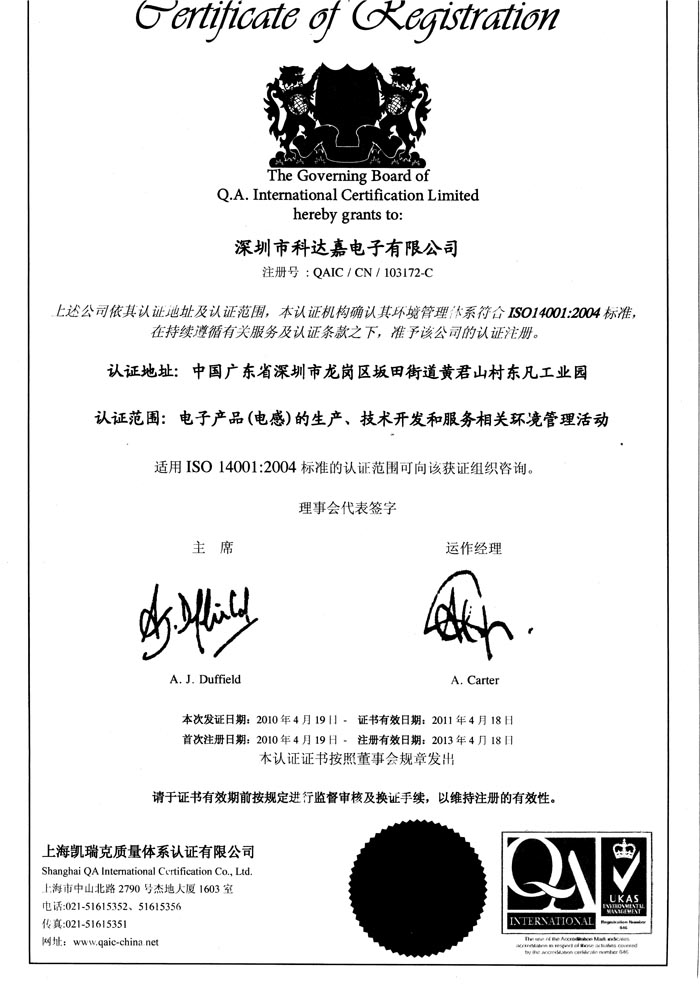 ISO14001環境體系認證證書